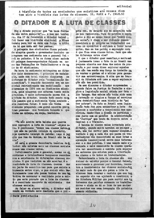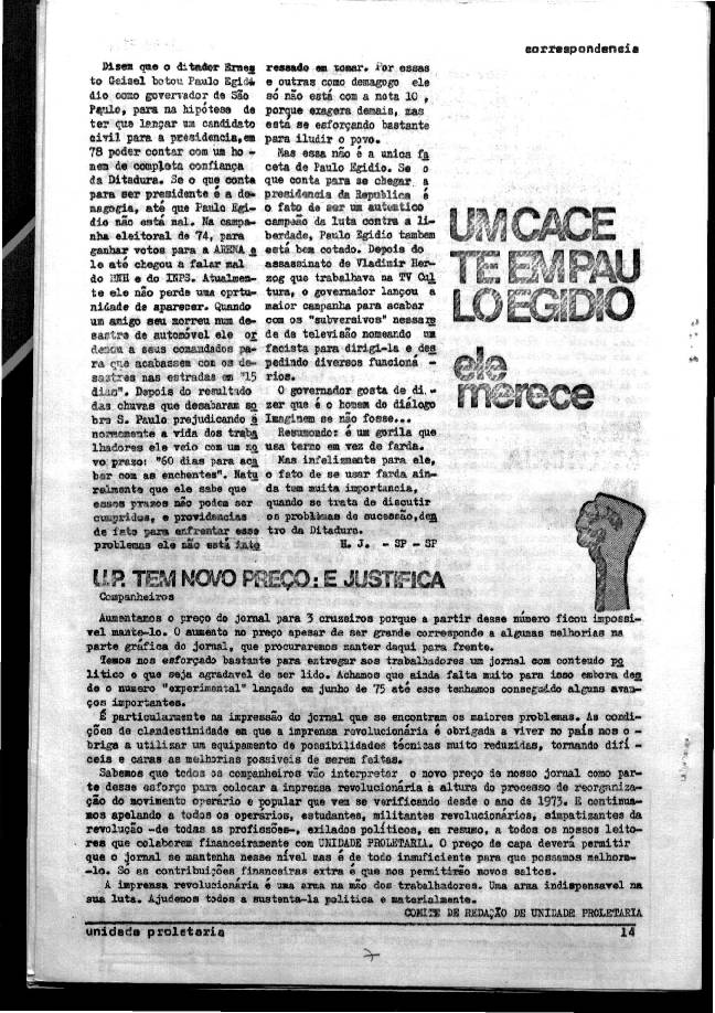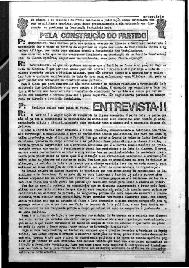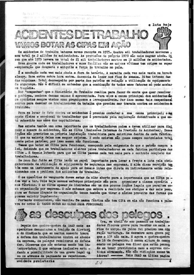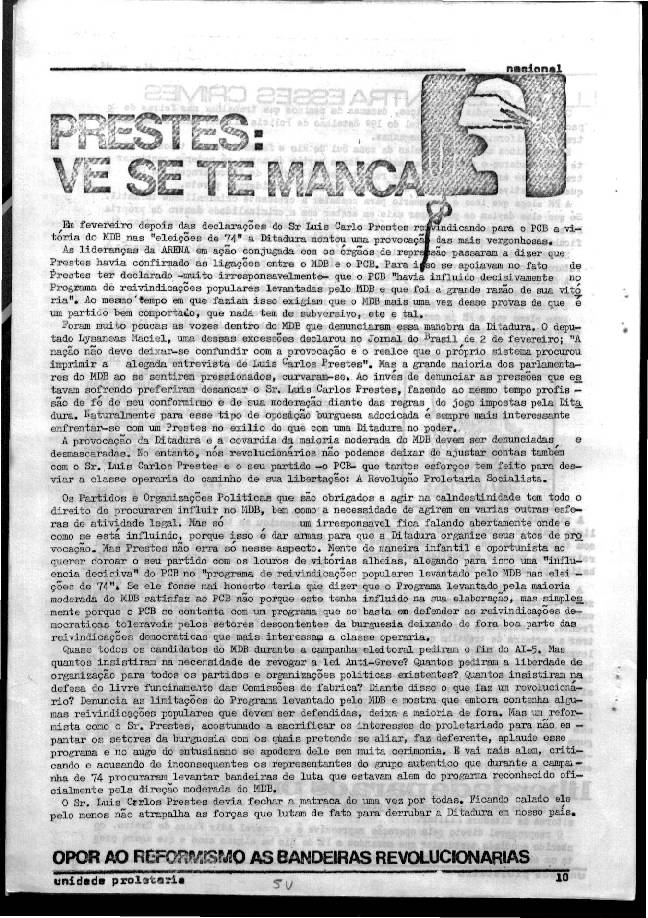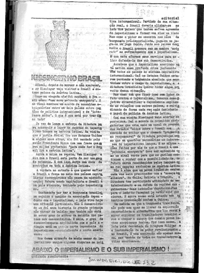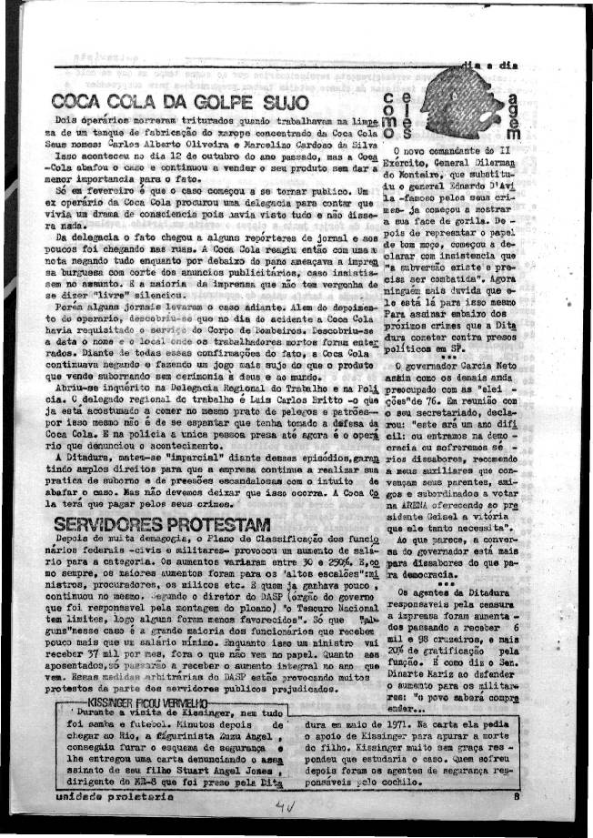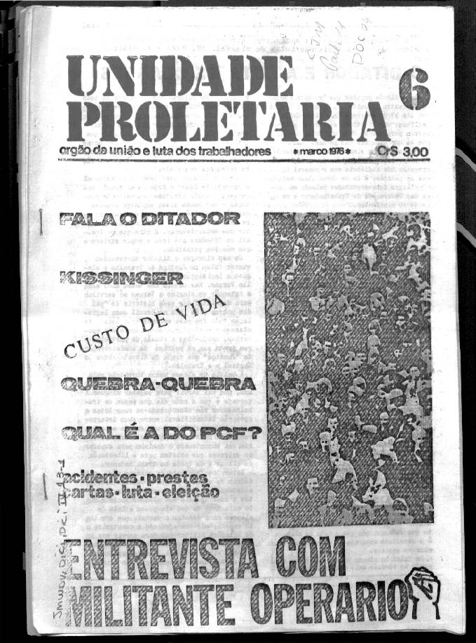 Periódico: “Unidade Proletária (Órgão de União e Luta dos Trabalhadores); Nº 6; Nesta edição contém: Fala o ditador; Kissinger; Custo de vida; Quebra-Quebra; Qual é a do PCF; Acidentes-Prestes, cartas-luta-eleição; Entrevista com militante operário;