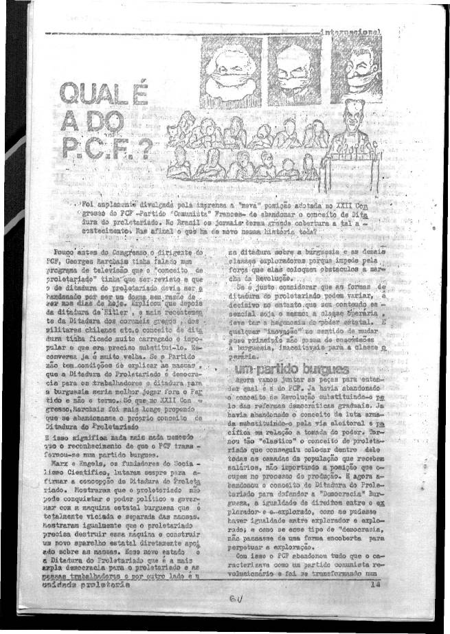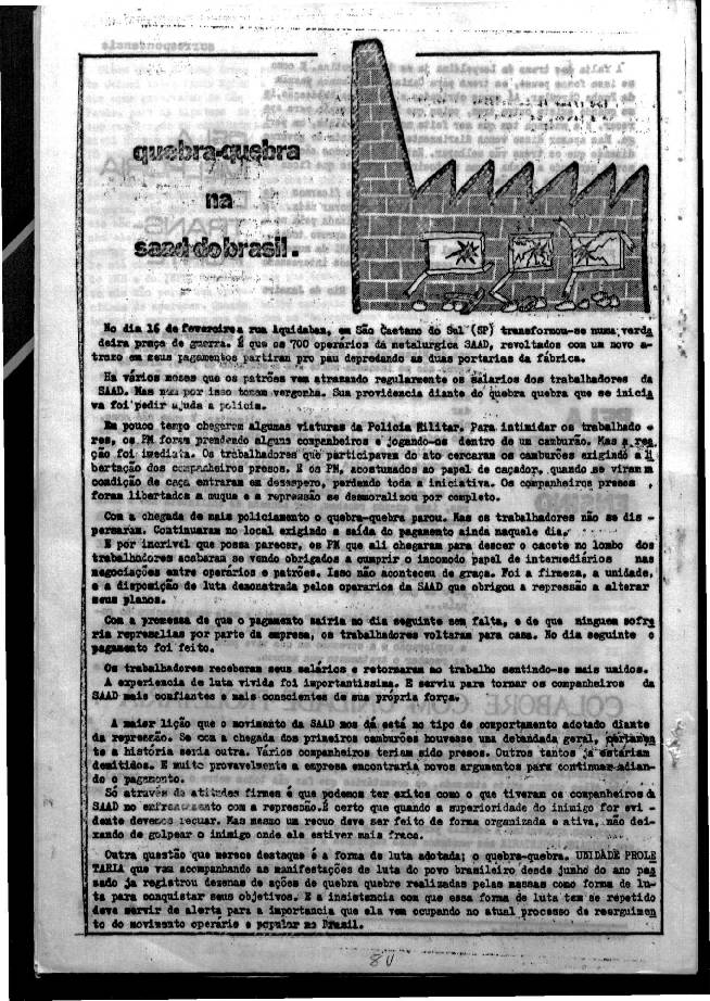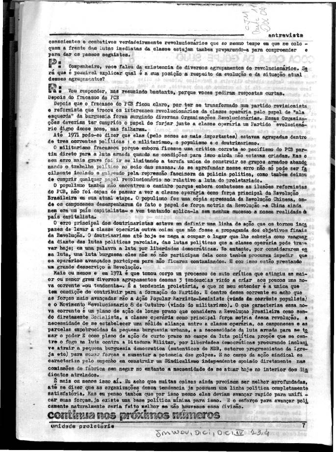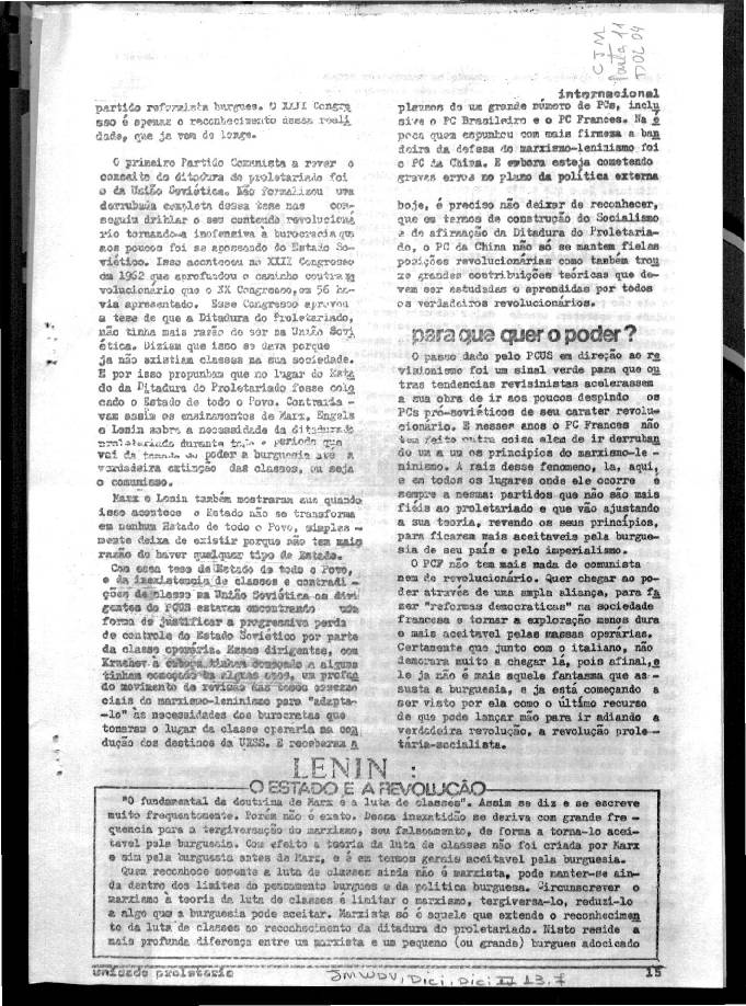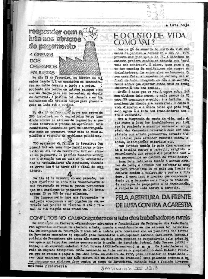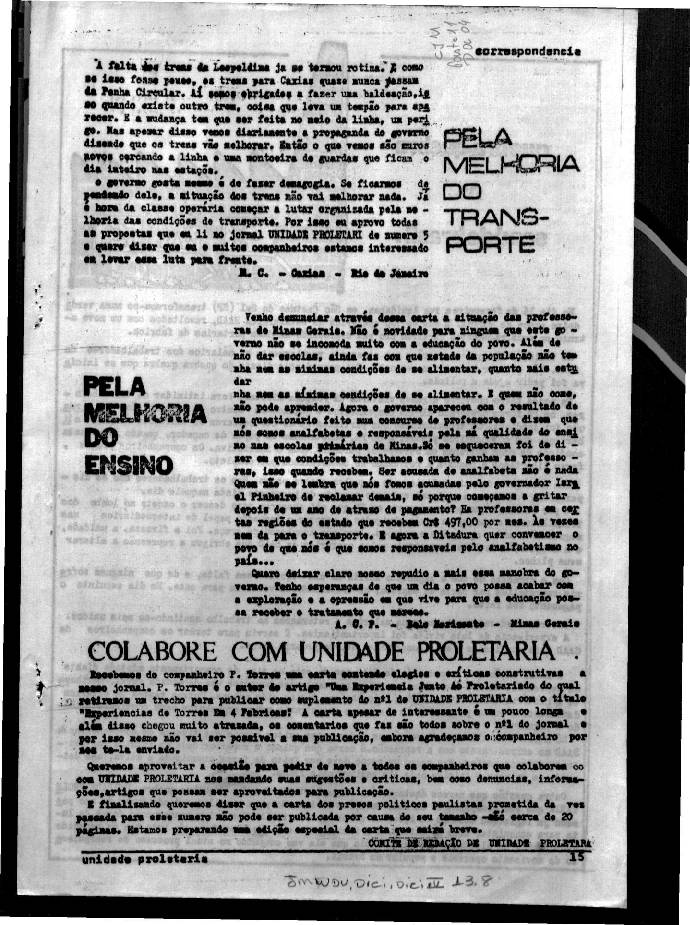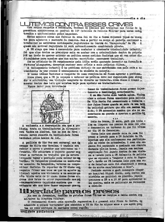 Periódico: “Unidade Proletária (Órgão de União e Luta dos Trabalhadores); Nº 6; Nesta edição contém: Fala o ditador; Kissinger; Custo de vida; Quebra-Quebra; Qual é a do PCF; Acidentes-Prestes, cartas-luta-eleição; Entrevista com militante operário;