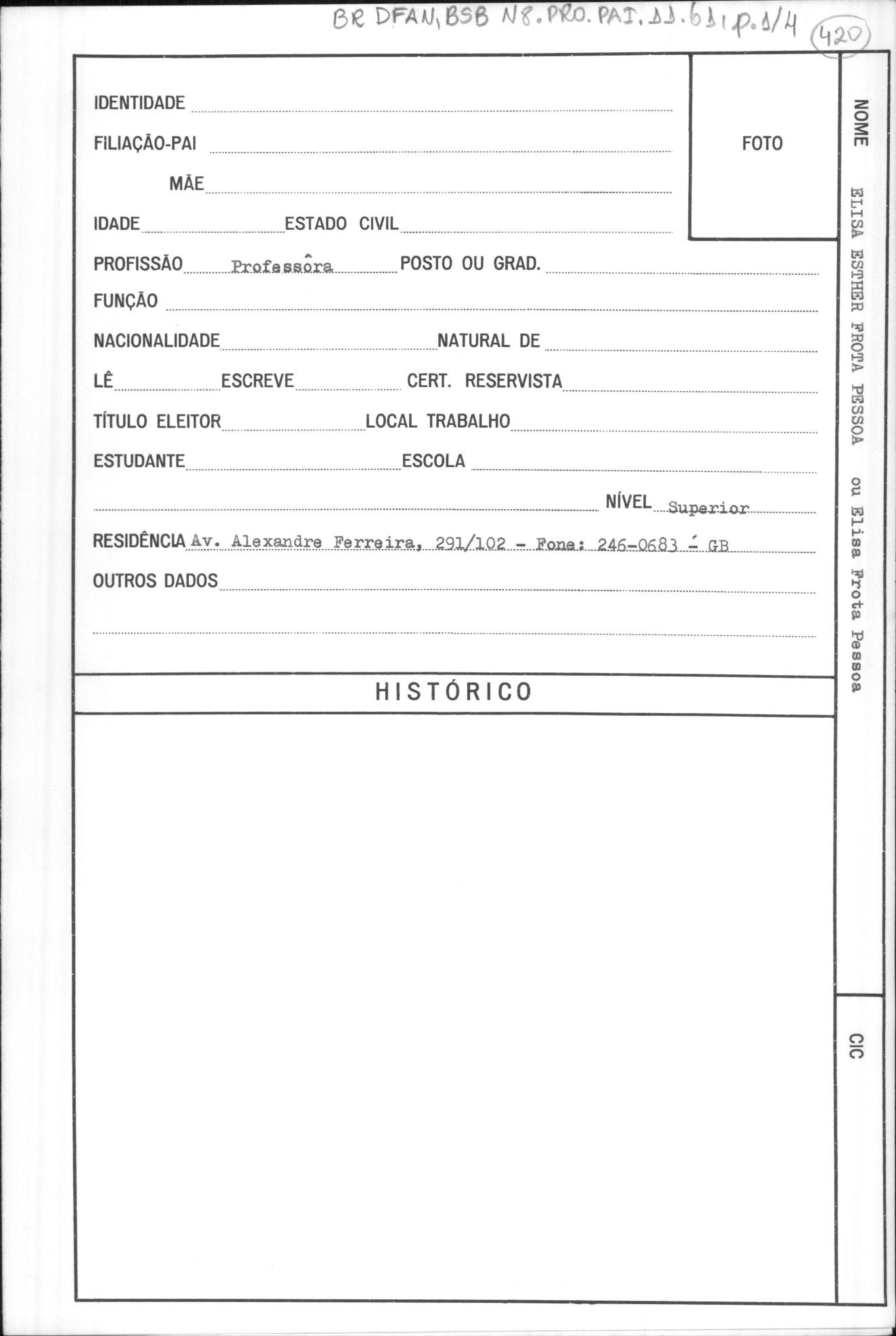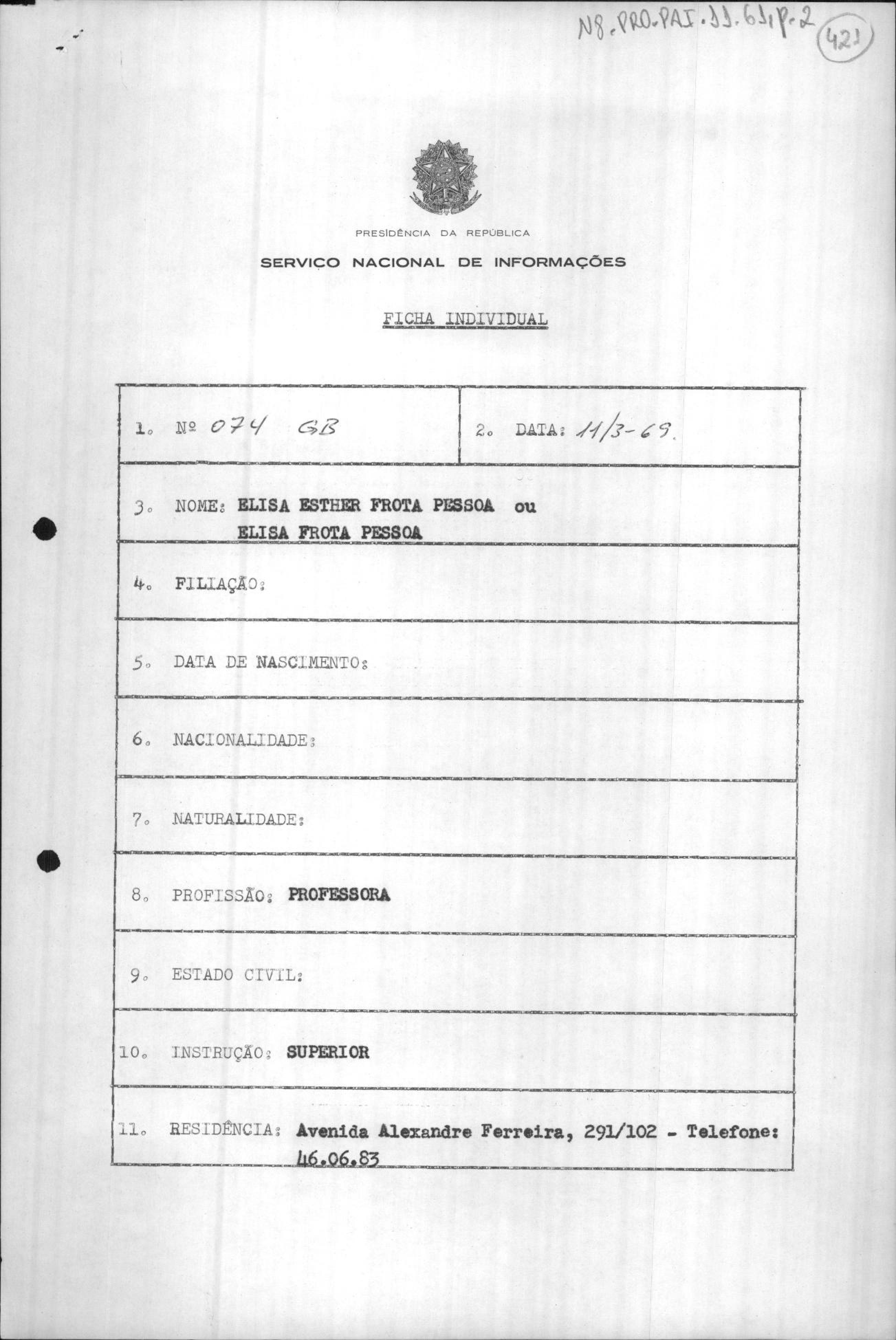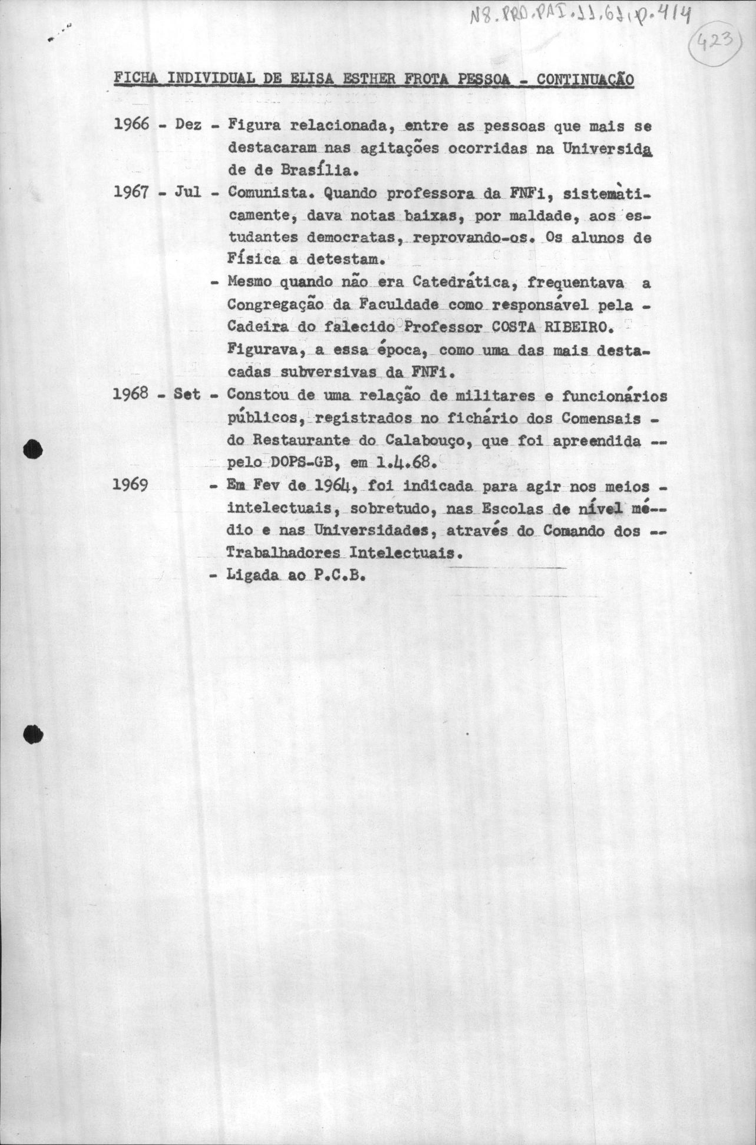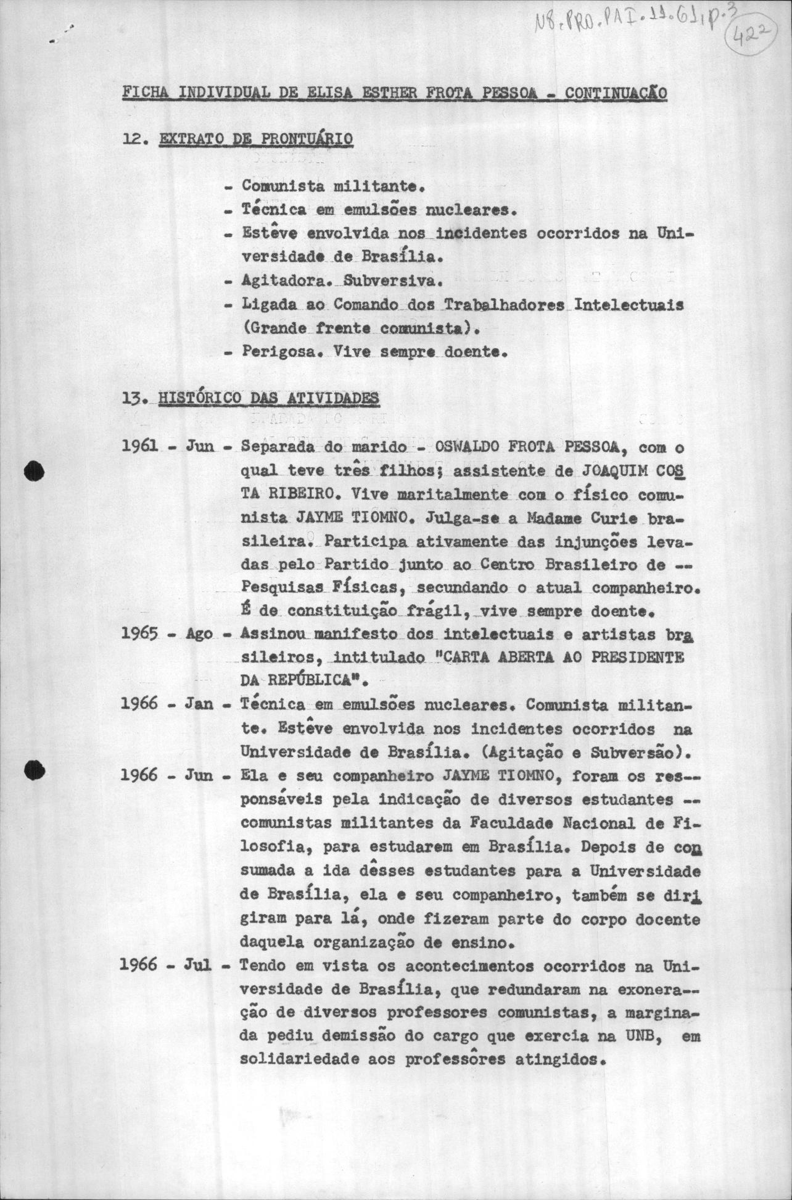 Em anexo documento emitido pelo Serviço Nacional de Informações para justificar a punição de Elina pelo AI5