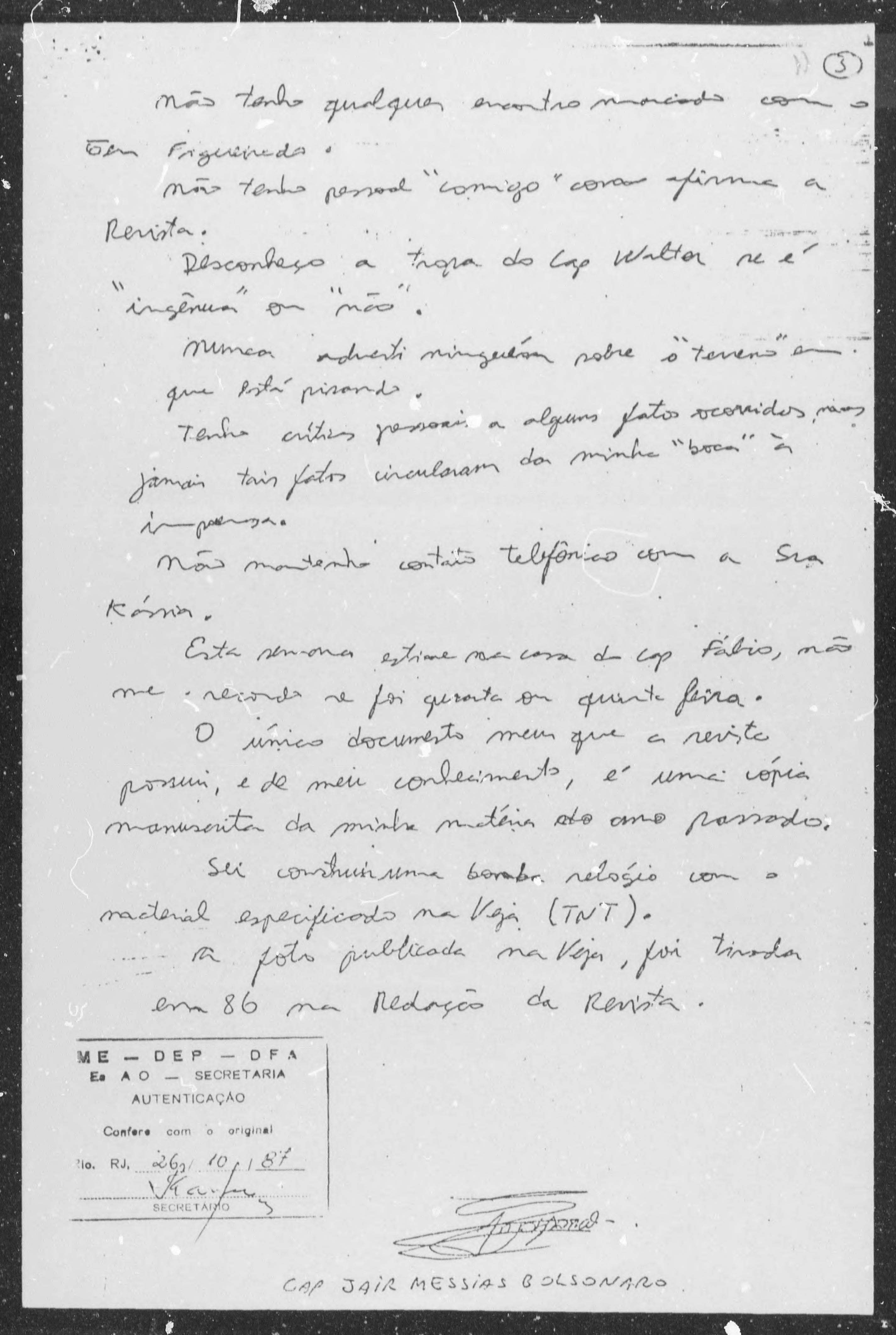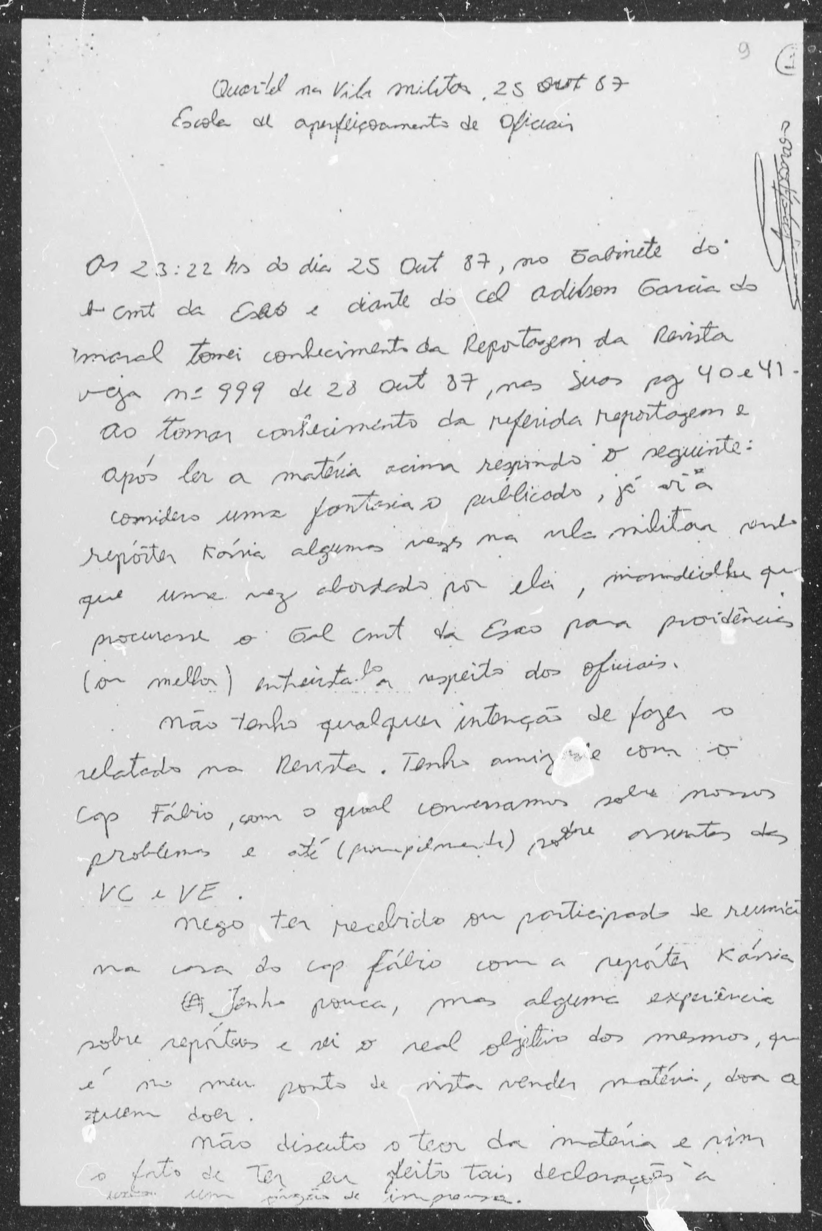 Bolsonaro foi intimado a comparecer ao Gabinete do Comandante da Escola de Aperfeiçoamento de Oficiais – EsAO, e após tomar conhecimento das punições que poderia receber, escreveu uma declaração negando tudo que havia dito na entrevista, acrescentando que nem conhecia a jornalista Cássia Maria.