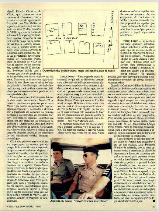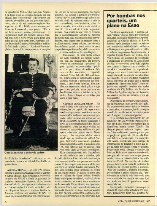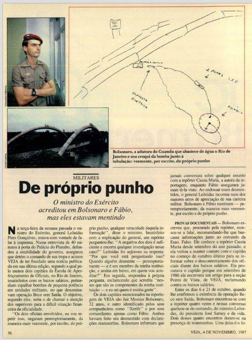 Na matéria que a revista semanal publicou, e irritou a alta oficialidade, o capitão Bolsonaro revelou minuciosamente, com desenhos e gráficos, seu plano de colocar bombas na Vila Militar, na Academia Militar das Agulhas Negras e em quartéis do Rio de Janeiro, além de explodir a Adutora do Guandu, que abastece de água potável a cidade do Rio de Janeiro.