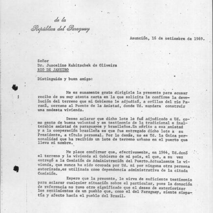 Em 1969, o ex-presidente Juscelino Kubitschek, enviou carta ao presidente do Paraguai, general Alfredo Stroessner, renunciando o terreno que havia ganhado do ditador. Durante o período em que deteve o …