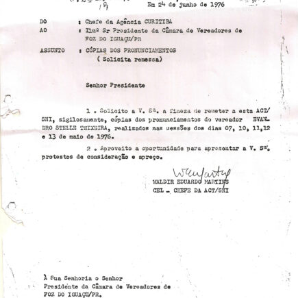 Durante seus dois últimos mandados na Câmara de Vereadores de Foz do Iguaçu, Evandro Stelle Teixeira, foi monitorado pelos órgãos de repressão da ditadura militar. Teixeira como era conhecido, tinha …