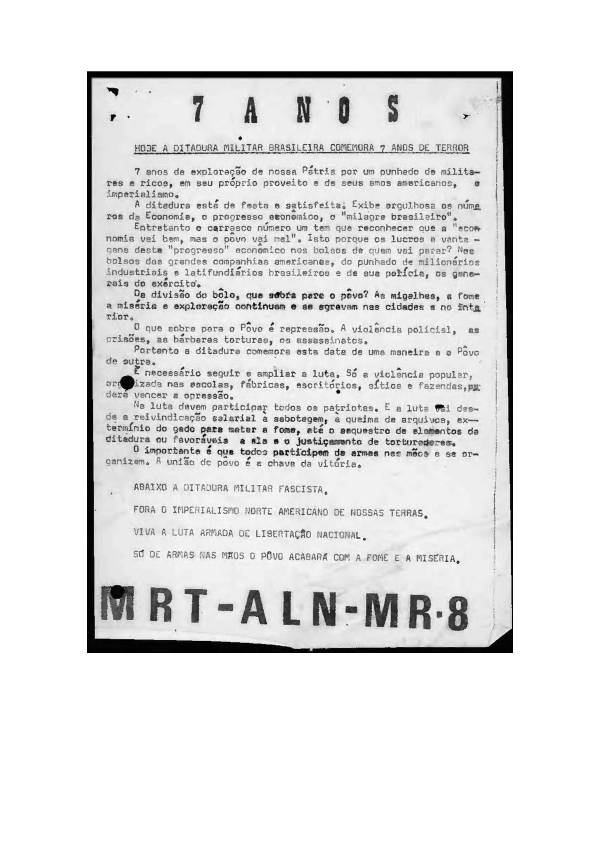 Panfleto denunciando crimes da ditadura por ocasião do sétimo aniversario do golpe civil militar