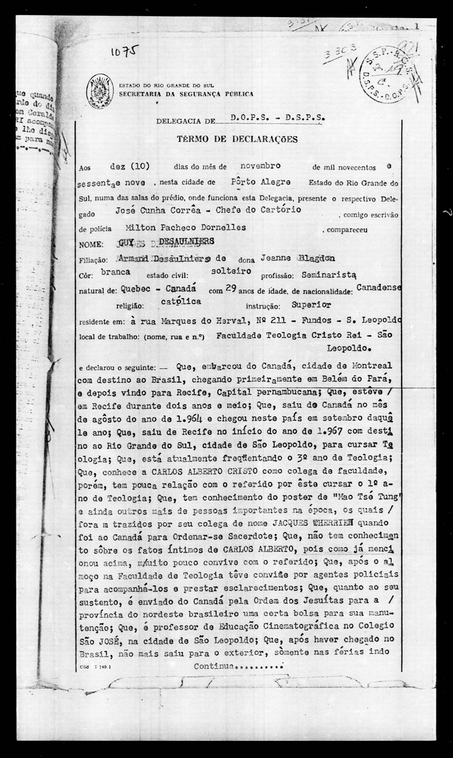 Relatorio de batida policial DOPS no Seminario Cristo Rei, em Sao Leopoldo.