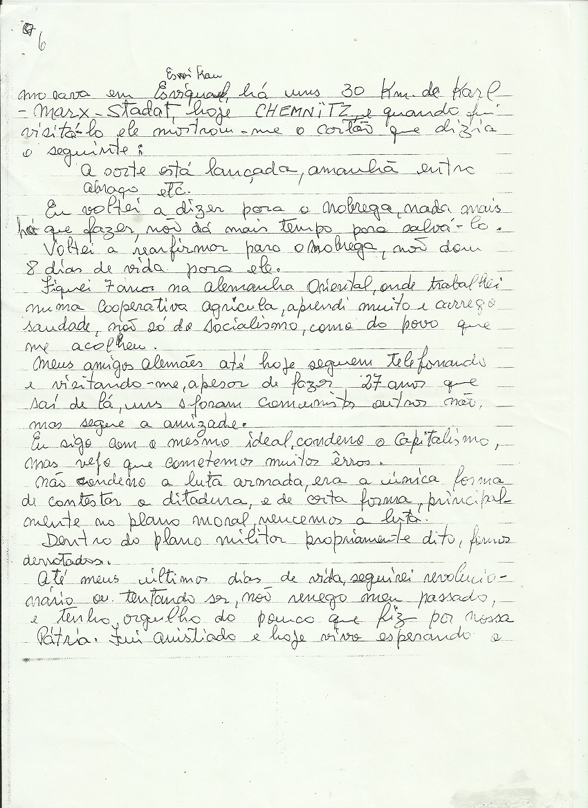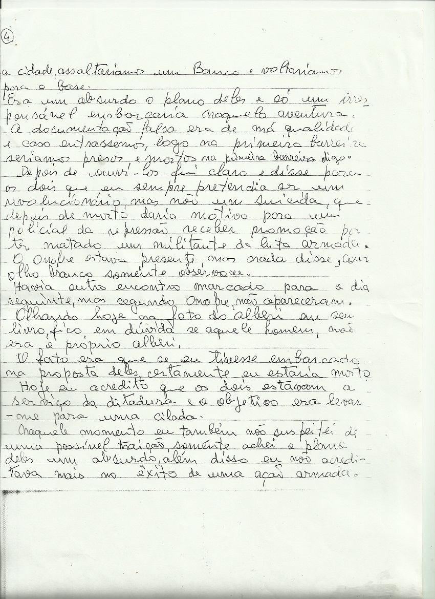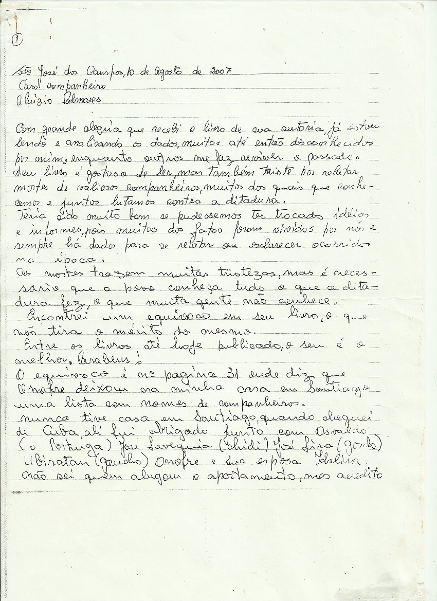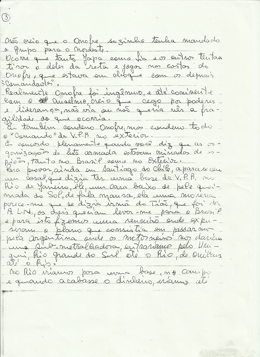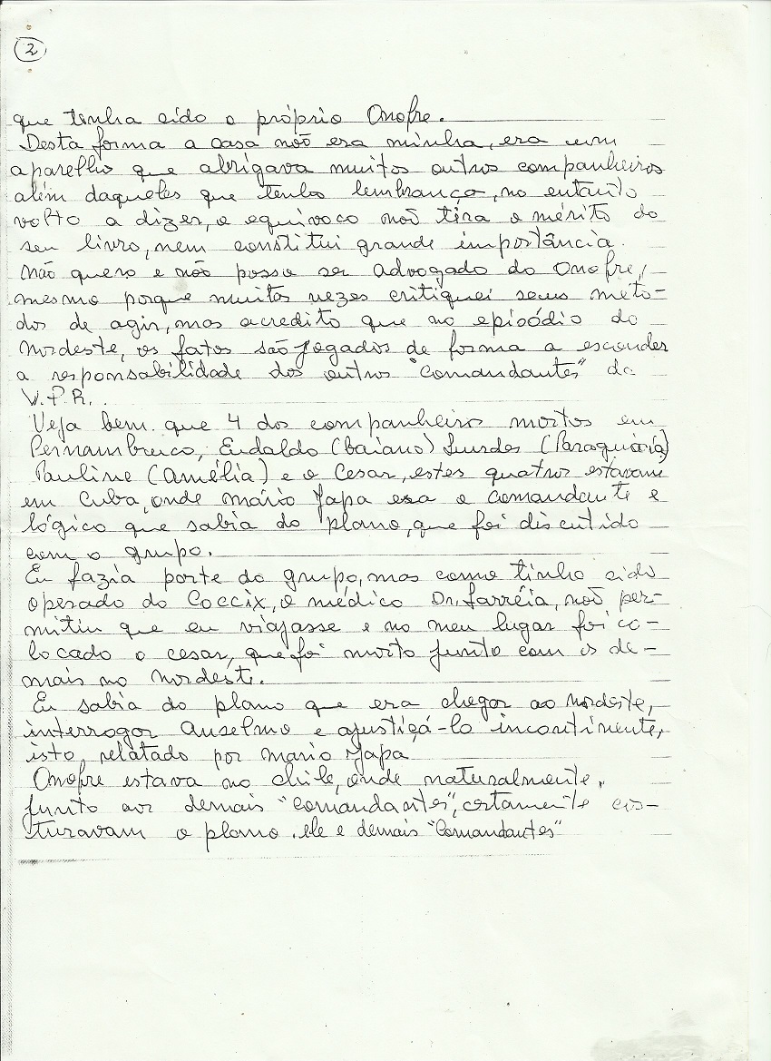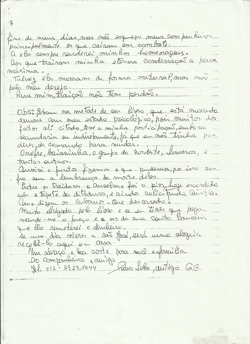 Na carta, Pedro Lobo, faz inúmeras revelações sobre as divergências internas entre o grupo fundador da VPR e conta como foram seus últimos momentos com seu compadre Onofre Pinto.